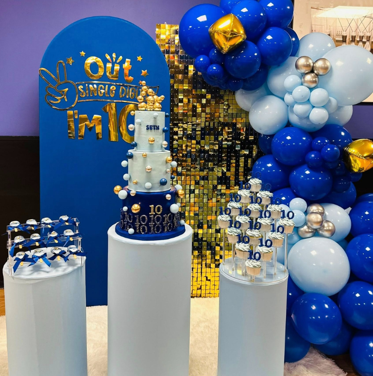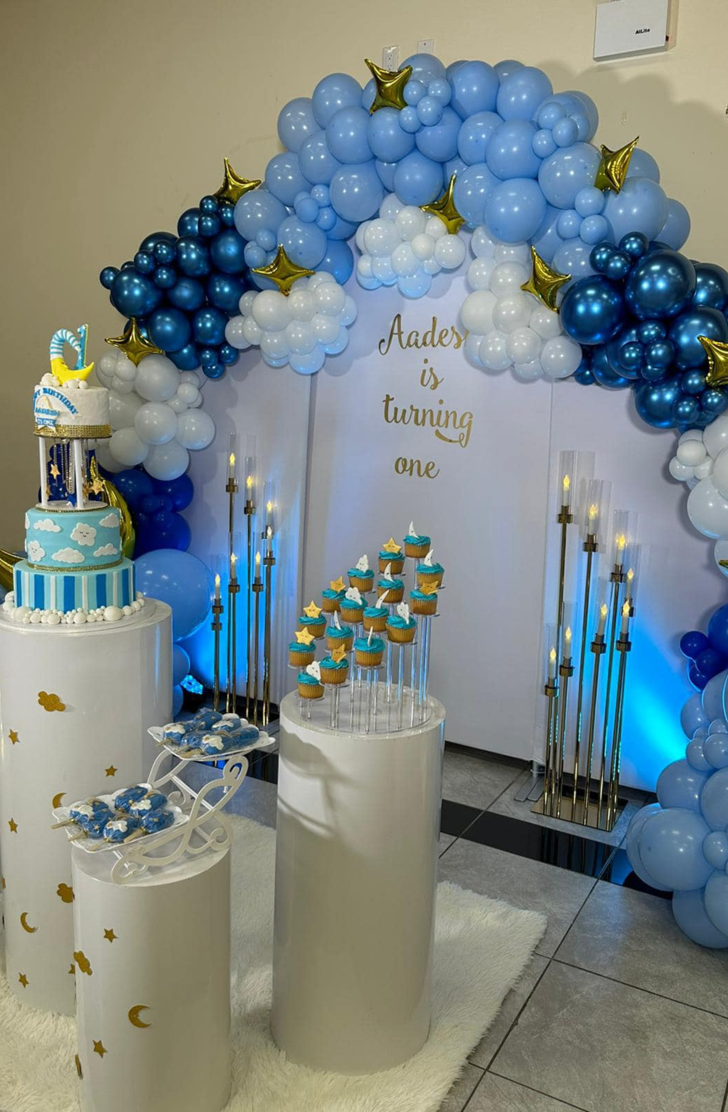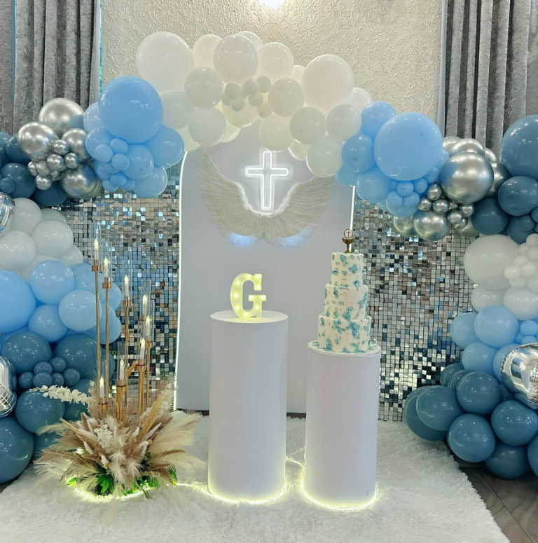 Soft blue balloons and elegant accents for a meaningful celebration.