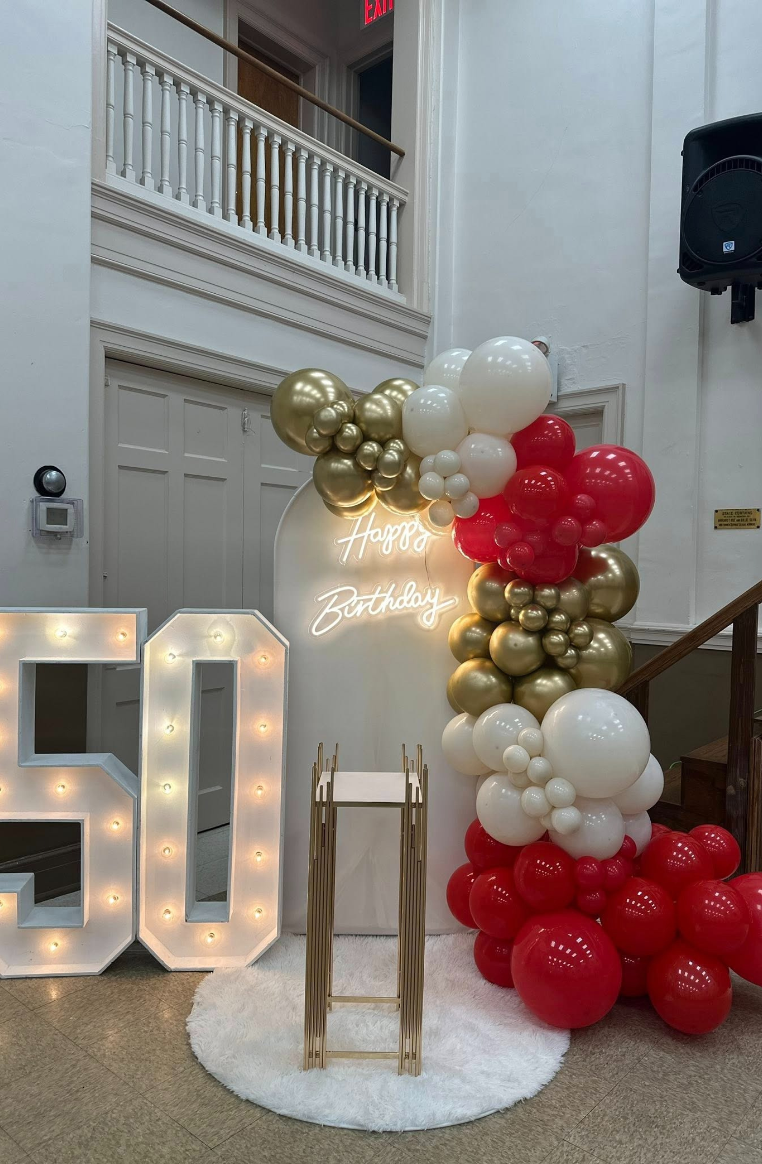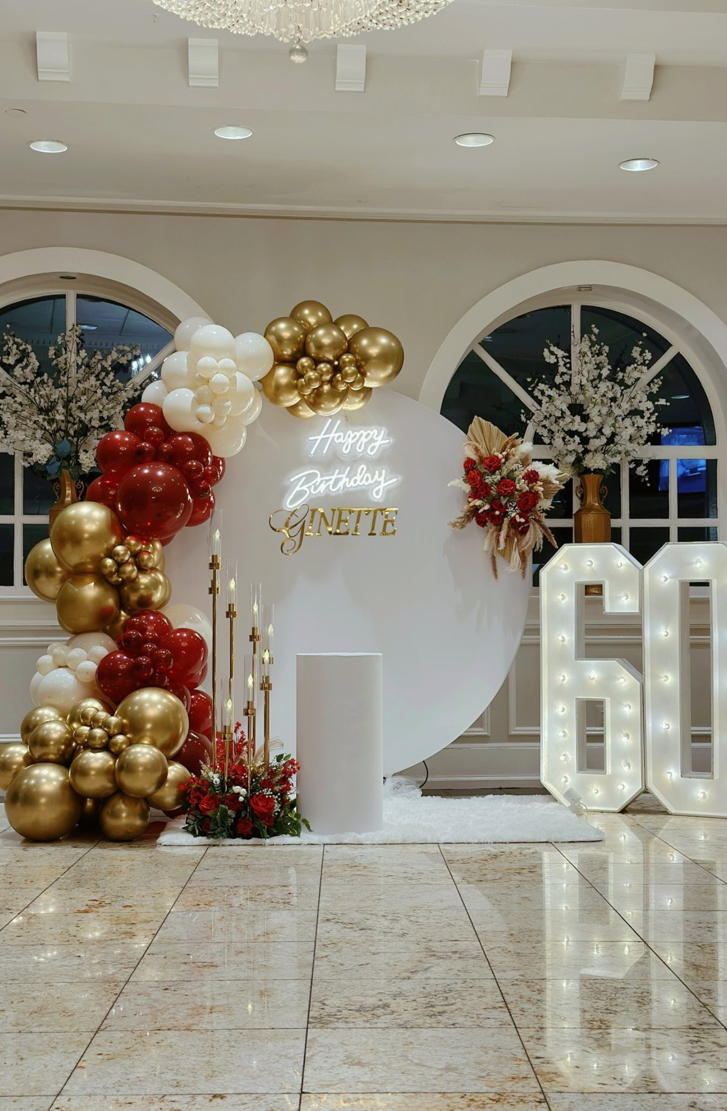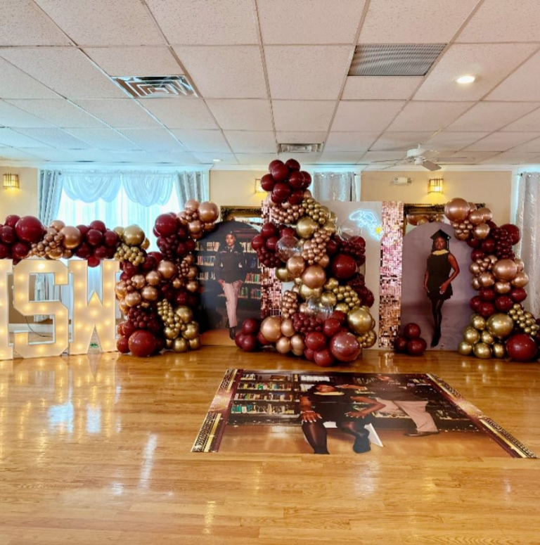 A bold burgundy and gold balloon backdrop with custom photo details, designed to honor a proud milestone.