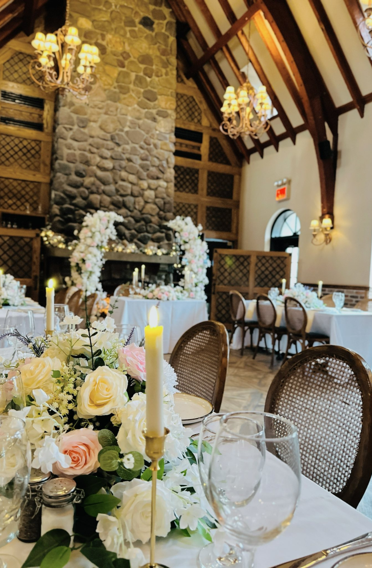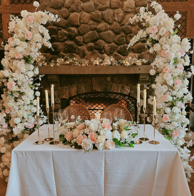Lush white florals paired with gentle lighting for a romantic wedding setting.